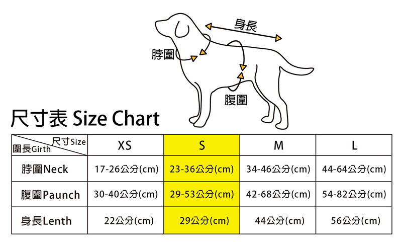 S尺寸-脖圍23-36公分|腹圍29-53公分|身長29公分