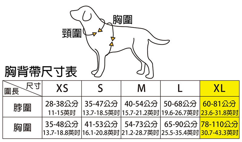 XL尺寸-脖圍60-81公分(23.6-31.8英吋)|胸圍78-110公分(30.7-43.3英吋)