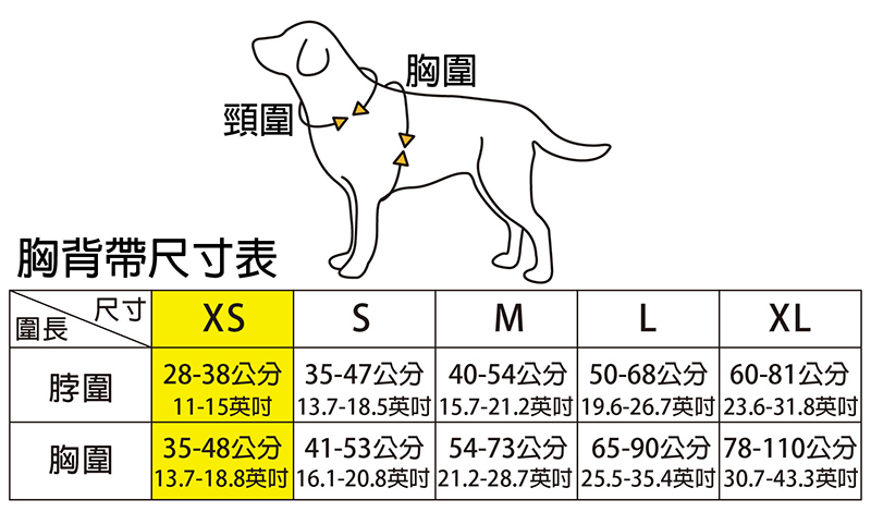 XS尺寸-脖圍28-38公分(11-15英吋)|胸圍35-48公分(13.7-18.8英吋)